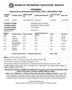 MP Board 10th Topper 2026 : 500 में से 499 नंबर हासिल कर मध्य प्रदेश के पन्ना जिले के गुन्नौर की प्रतिभा सिंह सोलंकी ने इतिहास रचा है. प्रतिभा एमपी बोर्ड 10वीं की परीक्षा में 99.80% मार्क्स लाकर रैंक 1 टॉपर बनी हैं. सोशल मीडिया में प्रतिभा की मार्कशीट तेजी से वायरल है.