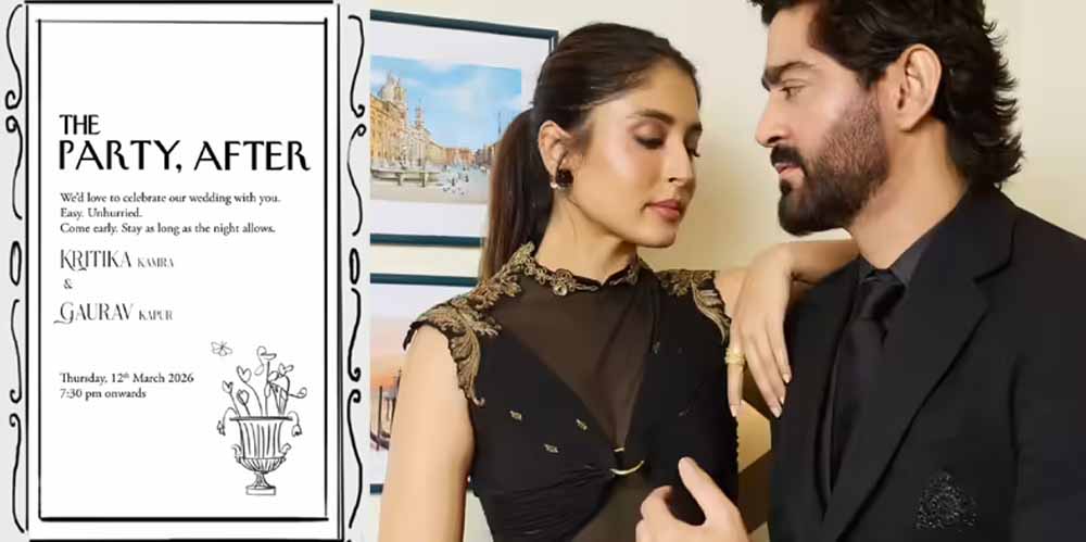 कृतिका कामरा और गौरव कपूर ने के इस इन्विटेशन कार्ड में 12 मार्च को एक आरामदायक, बिना हड़बड़ी वाली आफ्टर-पार्टी की प्लानिंग की गई है। इस कार्ड में 'द पार्टी, आफ्टर' लिखते हुए कहा गया है, 'हम अपनी शादी की खुशियों को आपलोगों के साथ सुकून से सेलिब्रेट करना चाहते हैं। जल्दी आइए और जितनी देर रात तक रुक सकें रुकिए।' ये आफ्टर पार्टी 12 मार्च को 7:30 बजे शाम से शुरू होगी।