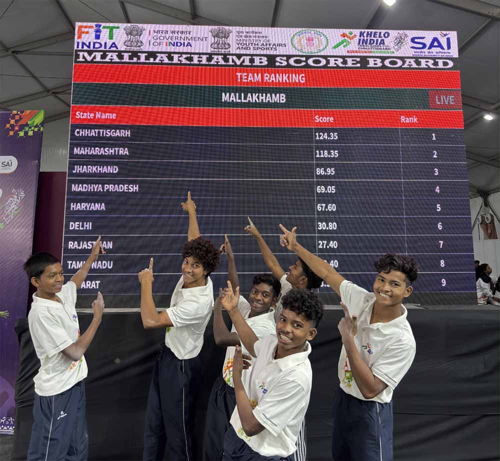 आज हुई स्पर्धा में छत्तीसगढ़ की मल्लखंभ टीम ने उत्कृष्ट प्रदर्शन करते हुए राष्ट्रीय खेल खेलो इंडिया एवं बीच गेम्स आदि के दोनों वर्गों में विजेता रहे। छत्तीसगढ़ ने 124.35 अंक के साथ प्रथम, महाराष्ट्र ने 118.35 अंक के साथ द्वितीय एवं झारखंड ने 86.95 अंक के साथ तृतीय स्थान हासिल किया।