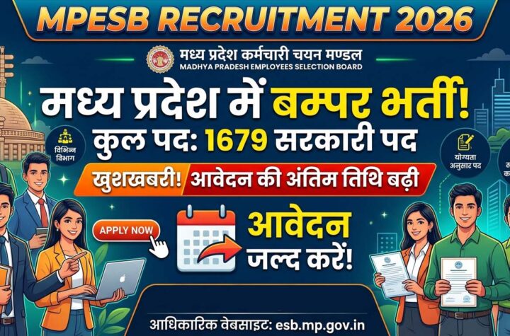 MPESB Recruitment 2026: 1679 सरकारी पदों पर भर्ती, आवेदन की आखिरी तारीख बढ़ी—जल्द करें अप्लाई 4 days ago Editor भोपाल मध्य प्रदेश में सरकारी नौकरी की तलाश कर रहे युवाओं के लिए एक महत्वपूर्ण अपडेट है। मध्य प्रदेश कर्मचारी...