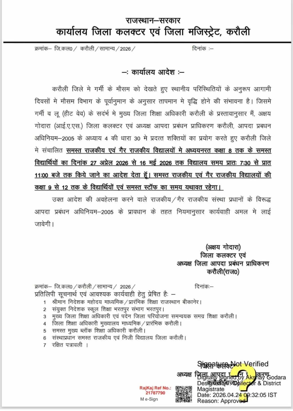 करौली में बढ़ती गर्मी और हीटवेव के खतरे को देखते हुए जिला प्रशासन ने बड़ा फैसला लिया है. जिला कलेक्टर अक्षय गोदारा ने आदेश जारी कर सभी सरकारी और प्राइवेट स्कूलों में कक्षा 1 से 8 तक के विद्यार्थियों के लिए स्कूल समय में बदलाव किया है. यह आदेश 27 अप्रैल 2026 से 16 मई 2026 तक प्रभावी रहेगा. प्रशासन का कहना है कि यह निर्णय बच्चों के स्वास्थ्य और सुरक्षा को ध्यान में रखते हुए लिया गया है.